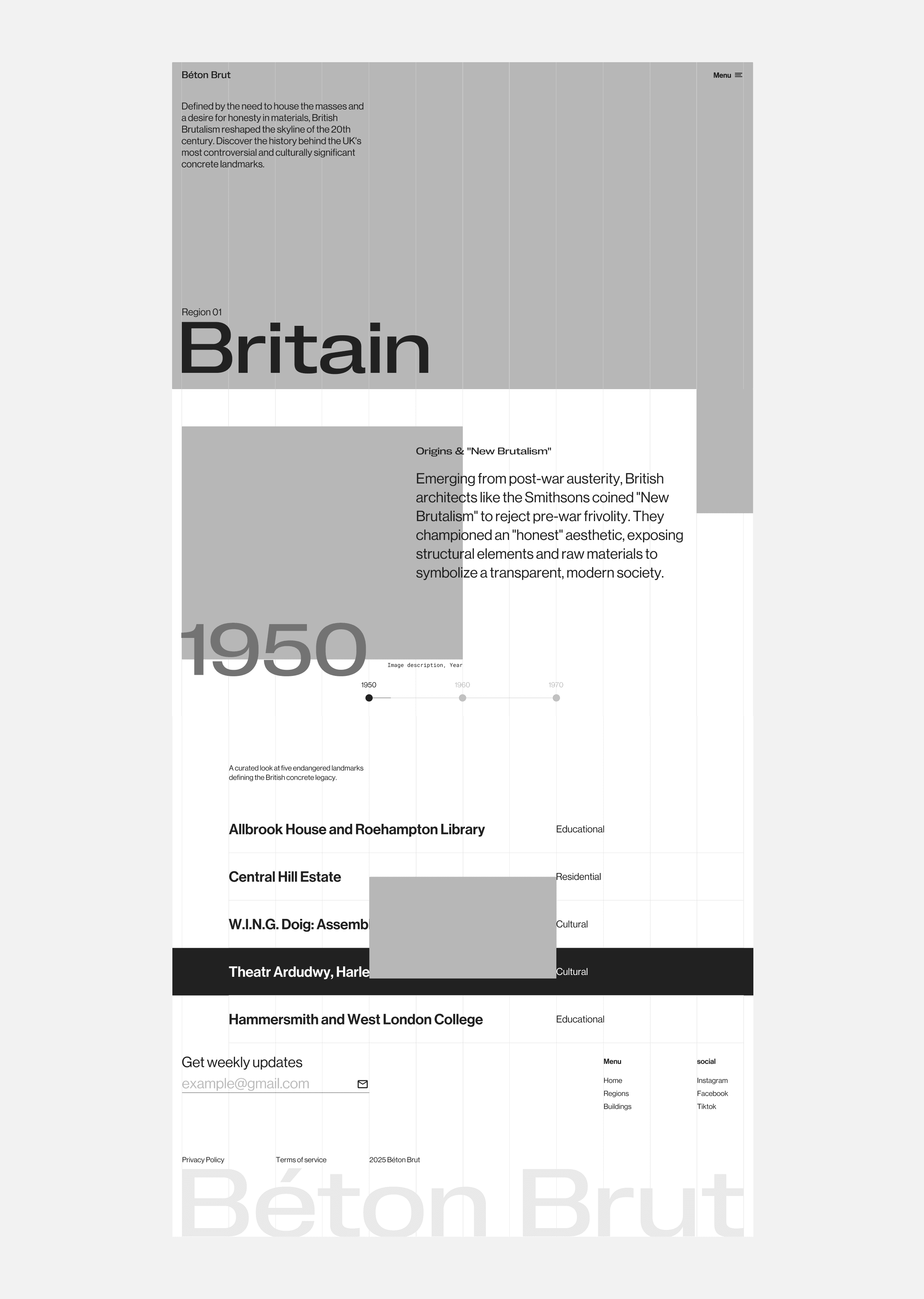 Architecture students often struggle with dry textbooks. To solve this, I designed an interactive digital museum that replaces passive reading with active exploration. The platform transforms the study of 'urban eyesores' into a compelling narrative, making Brutalist history accessible and engaging.