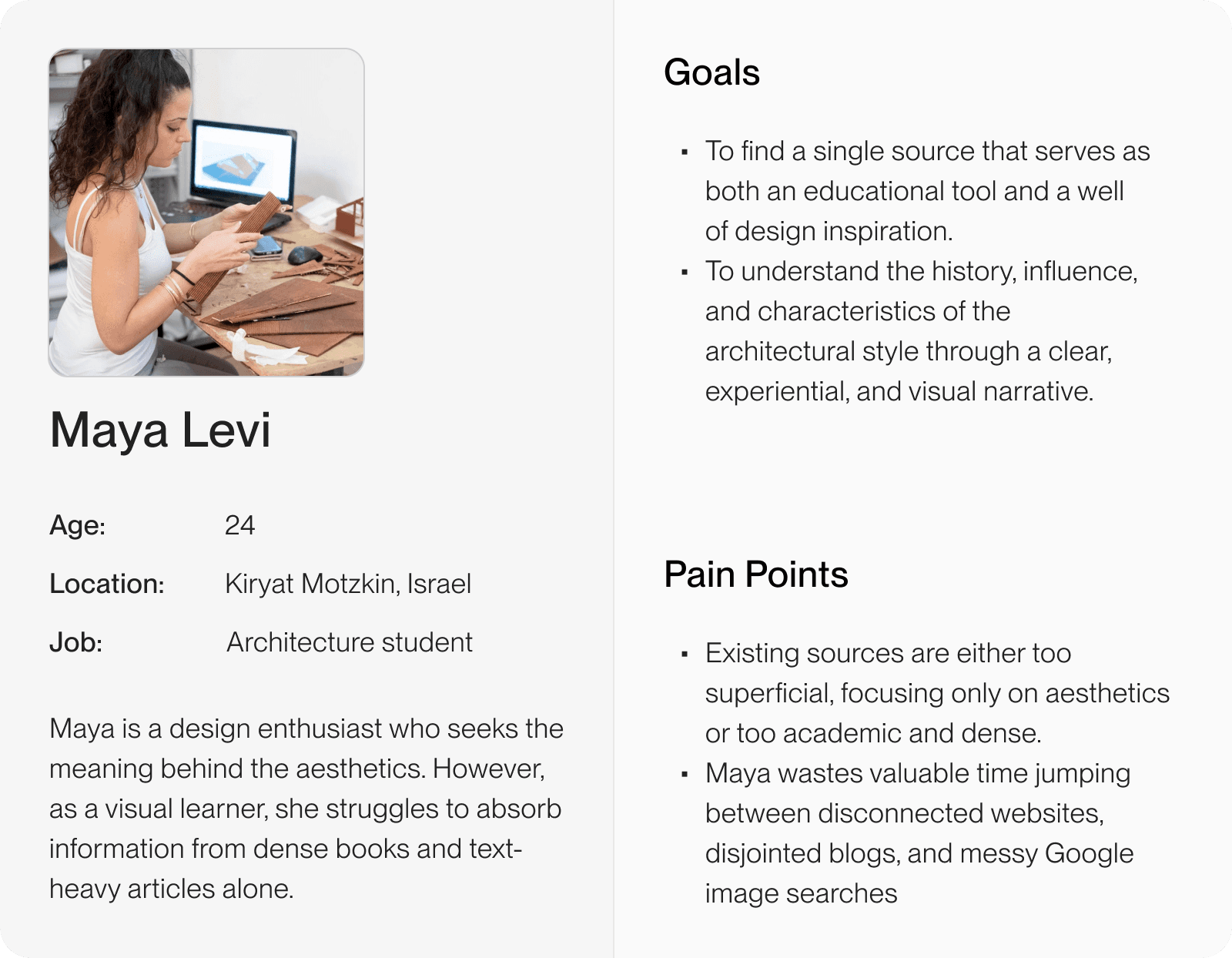 I created the 'Architecture Student' persona to represent the main user. This character express the main pain points of the users.